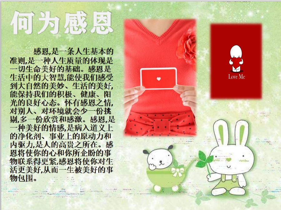 感恩就是中华民族的传统美德之一。每人都应怀揣一颗感恩之心。感谢生活、感谢父母、感谢师长,感谢朋友等,如果人与人之间缺乏感恩之心,必然会导致人际关系的冷淡,所以,每个人都 应该学会感恩。我们做教师的更应该教育孩子从小知道 感恩