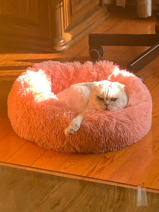 这是我的猫,它正慵懒地躺在粉色的毛绒猫窝里。阳光透过窗户洒在它身上,给它镀上了一层温暖的光晕。它那白色的毛发柔软蓬松,与粉色的猫窝相得益彰。它的眼睛半睁半闭,一副慵懒的模样,仿佛在享受着这片刻的宁静。一只爪子随意地搭在窝边,像是在向我撒娇。看着它这么放松,我也感到无比惬意。这就是我的猫,一个喜欢在阳光下打盹的小家伙。