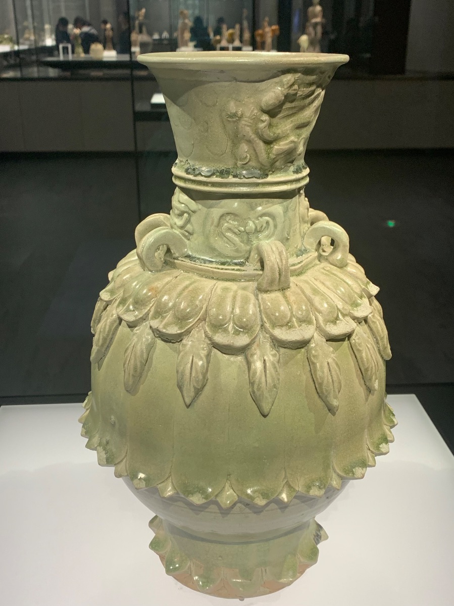 这是我喜欢的一件作品。它是一只青绿色的瓷器,造型典雅大气。颈部雕刻着精美的花纹,仿佛在诉说着古老的故事。肩部有几个环形的把手,设计独特而实用。腹部装饰着层层叠叠的花瓣状纹饰,细腻而富有立体感。底部的花瓣边缘微微上翘,给人一种轻盈的感觉。整体釉色均匀,质感温润,仿佛蕴含着岁月的沉淀。这件作品不仅展现了古代工匠的精湛技艺,也让我感受到了传统文化的魅力。每次看到它,我都会被它的美深深吸引。