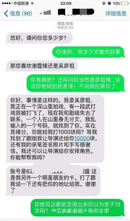 近日,有网友在微博上曝光了一则最新的诈骗信息。短信写道:“你好,我是霍建华,我正在深山里拍戏,有一段武打戏我被打飞了,我和剧组失去联系了。我身无分文,乱输了一个电话号码,就找到了你,实在是缘分,能给我打1000块钱吗?等我回剧组还你10000,还有我的亲笔签名照和手写感谢信。还可以让导演给安排角色。你能棒棒(帮帮)我吗?”该网友的回复也是超神:“那你能先告诉我你到底是喜欢乔恩还是胡歌吗?”