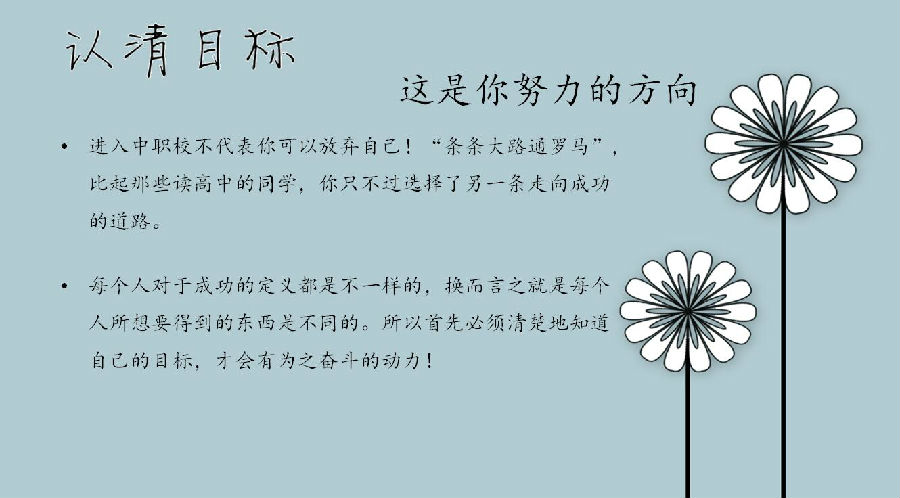 “不论你为何会进入职校,也不论你为何选择现在的专业。如果你想要上进,就必须分析局势,充分了解你所处的环境,从而制定你的学习计划。”