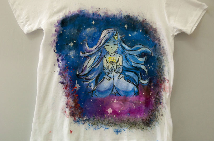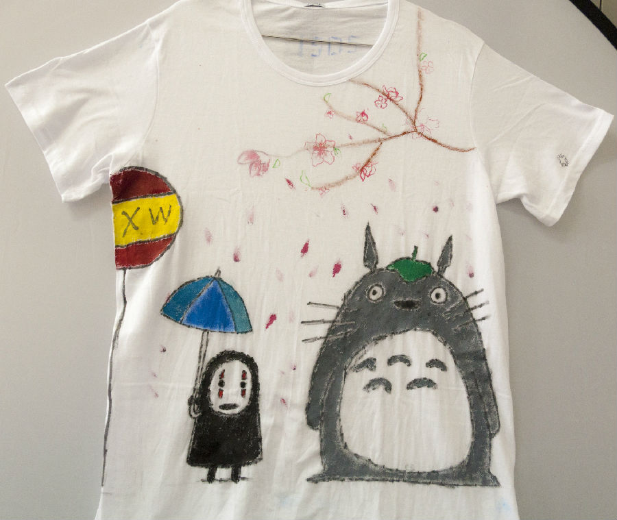 设计理念:夏日的燥热让人联想到春日空气中花草的芳香,而桃花就在这燥热的季节中增添一种小清新。桃花的制作我们是用橡皮刻出画的形状再印在衣服上,龙猫无脸男这个可爱的动漫人物在当今颇受大家的欢迎,所以我们则是把他们画在了衣服上,而龙猫、无脸男的特点就是守护他人;所以穿上这件衣服就会有一种被人守护的感觉。因为入夏时,桃花的凋零所以画上桃花就如同龙猫、无脸男守护者将要凋零的桃花。