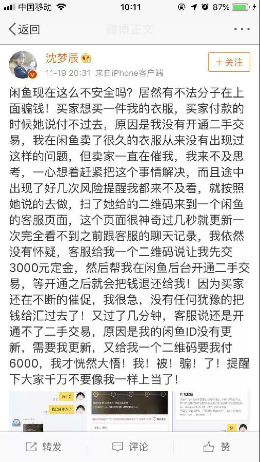 19日晚,湖南卫视当红主持人沈梦辰发了一条微博,自曝在网上卖衣服时遭遇骗局,被骗了3000元,还详细地贴出了被骗的全过程,并提醒大家千万不要像自己一样上当。