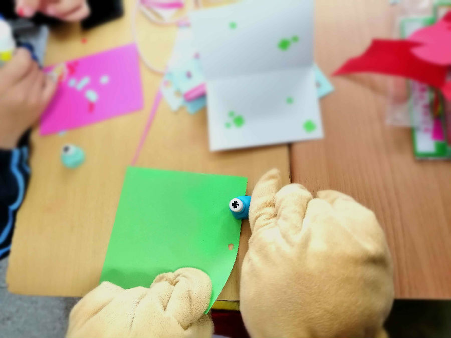 此时,当别的同学们都在制作贺卡的时候,我们好奇心满满的熊三岁,便悄咪咪地来到同学们的背后,看看同学们都做了什么样子的贺卡!