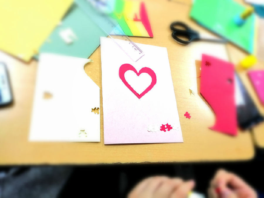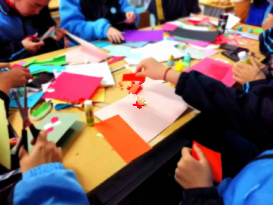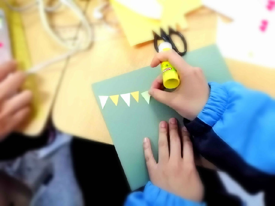 同学们也使用这剪刀胶水等工具为贺卡做着装饰。