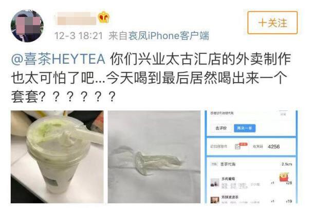 这不一网友疑似在喜茶中喝出指套。微博用户vermix发文称:“你们兴业太古汇店的外卖制作也太可怕了吧…今天喝到最后居然喝出来一个套套?”