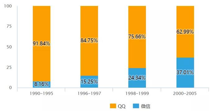 在这个问题的回答上,可以说QQ全军覆没,1990-1995年的同学放弃QQ的比例高达91.84%,即使是依然喜爱他的00后选择放弃QQ的也超过半数。