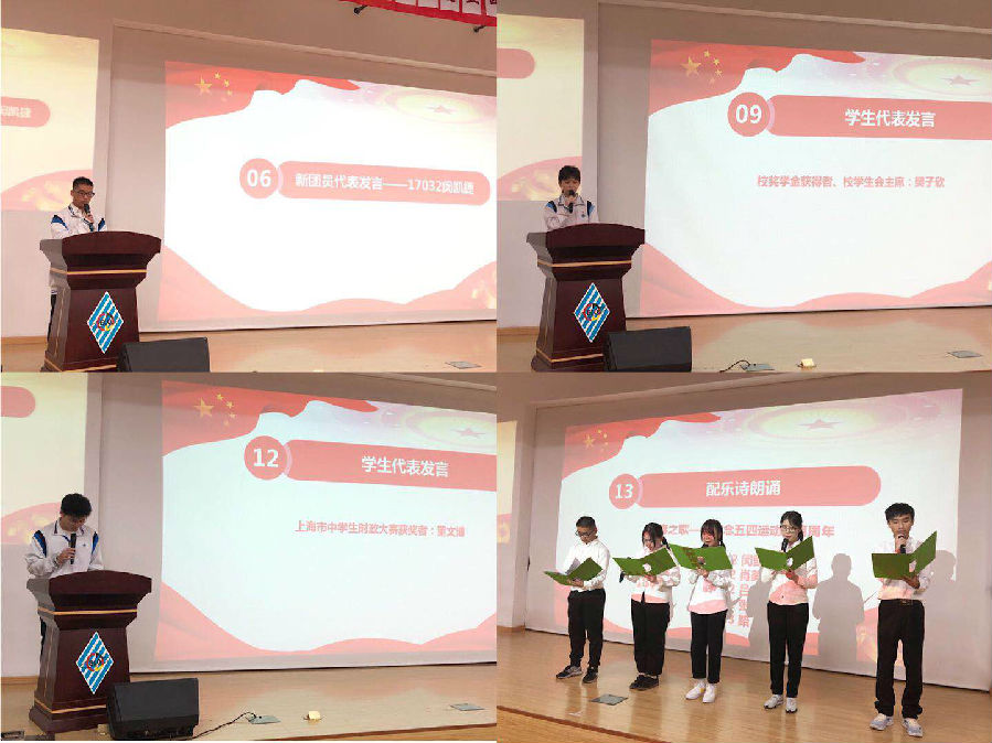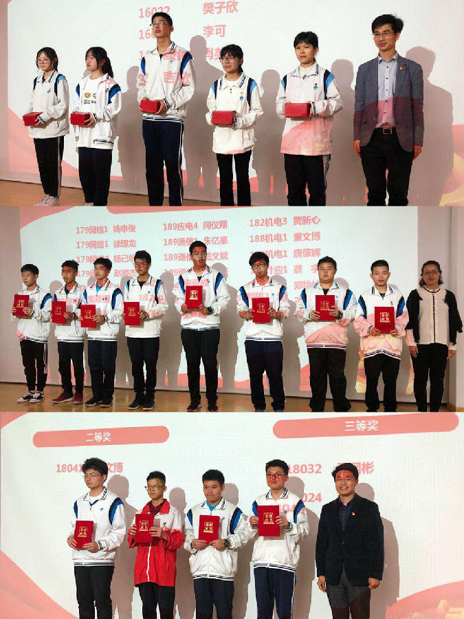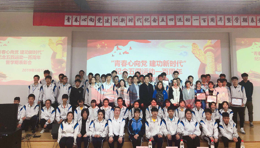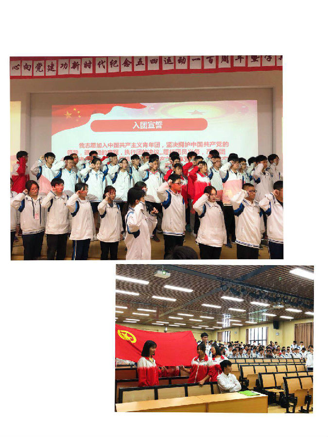 五星红旗飘荡于浩瀚的蓝天,祖国的花朵正努力的迈步向前!在5月15日的下午,随着嘹亮的国歌声回荡在宁静的校园中,我校就报告厅开展了“青春心向党 建功新时代”纪念五四运动一百周年主题教育活动,张贯彻副校长宣读了校级荣誉,表彰本学期的优秀学生及团体。评选出在校优秀团员,优秀团干等。一张张鲜红的奖状激励着所有人继续奋斗。在表彰结束之后,党组织迎接了在校学生中新的41位共青团团员入团,闪亮的团徽刻在他们的胸前,映照出的是党的光辉;高举握拳的右手宣誓着对党的忠诚。初入党的他们是一颗颗稚嫩的新芽,但在未来他们也终将绽放出绚丽的花朵!