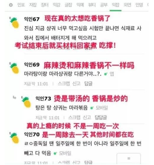 当有韩国网友说“麻辣烫使人上瘾,一周总有一天特别想吃”之后,上瘾攀比模式就开始了。有网友表示一周要吃两到四次,还有的网友说:“真正上瘾的时候,一周除去一天,其他时间都在吃!”