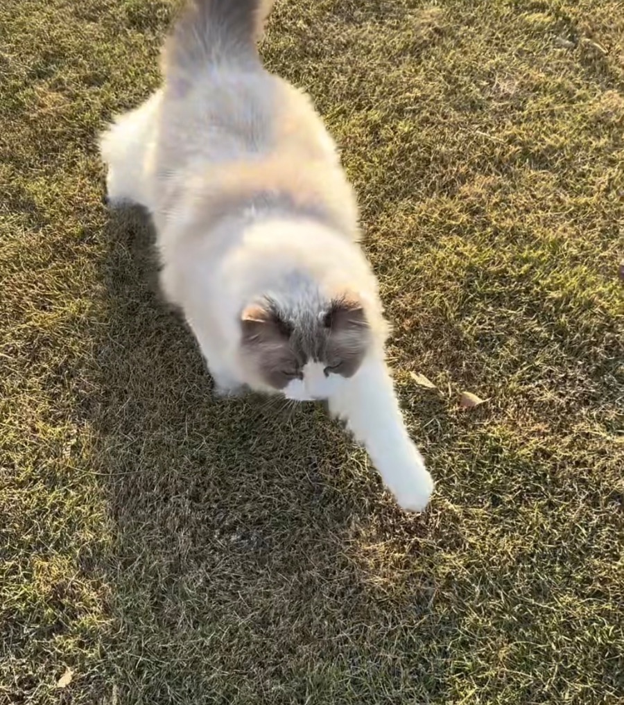 冬日的暖阳洒在草地上,给枯黄的草尖镀上一层温柔的金光,布偶猫迈着慢悠悠的步子踩在上面,蓬松的毛发被阳光烘得暖融融的,像团行走的云朵。