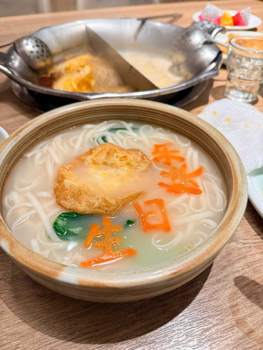 背景里的鸳鸯火锅与果盘,暗示着这是一场热闹的生日聚餐:一边是滚烫的红汤,一边是温润的骨汤,像生活里的热烈与平和,都在为这场生日庆祝。长寿面自古就有“长命百岁”的寓意,这碗面不仅是果腹的美食,更是将“岁岁平安、喜乐常伴”的期许,融进了每一口温热的汤面里,让平凡的一餐饭,变成了充满仪式感的生日记忆。