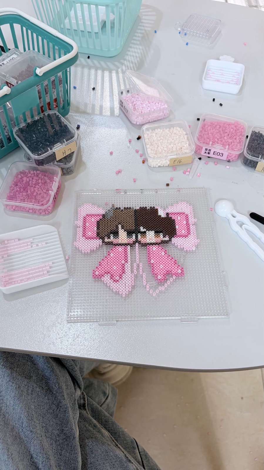 桌角上散落的粉棕豆粒,像是一捧被精心收集的春日碎光。你手持工具,在网格板上一针一线(一粒粒)地构建着那个可爱的形象。这一方小小的工作台,隔绝了外界的喧嚣,每一颗融合的豆豆都像是一次心跳的贴合。当粉色的蝴蝶结与深棕的发丝精准拼接,原本冰冷的塑料颗粒便拥有了鲜活的生命。这种专注是极具治愈力的,它让时间以一种可见的形态流淌、凝固。手作的魅力不在于最终那个成型的挂件,而在于此刻你全神贯注、只与美好对话的自己。这是专属于你的“像素艺术”,将热爱细细研磨,再一点点拼凑成心中的模样。